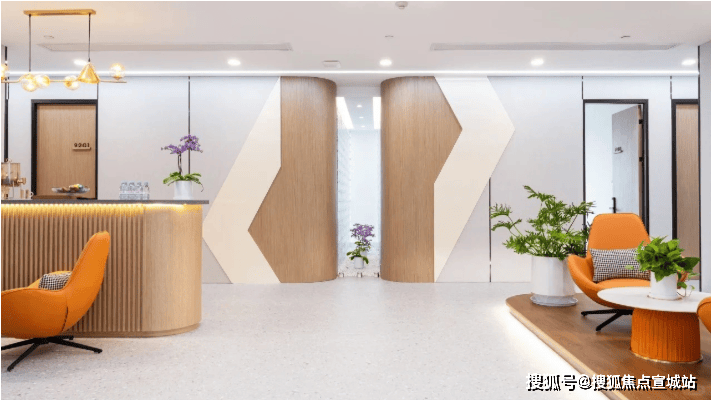 电梯厅及大堂采用暖色系大理石与拼花玻璃,挑高设计营造高端商务氛围.