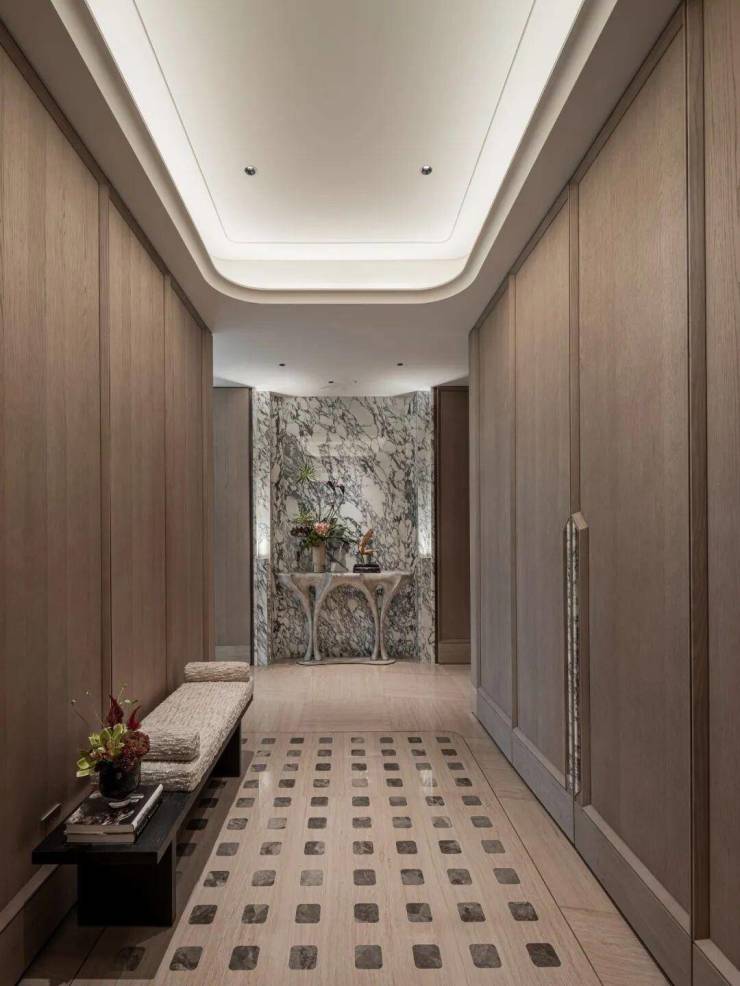 205方的由意大利设计师Andrea Bonini亲自操刀,紫山水石材从踢脚线攀升,直到客厅吊顶,在嵌入式灯带的烘托下,如月光般柔和,与温润的木饰面形成层次和谐的反差。大家咏印明庐售楼处电话:400-9016-520⭐⭐