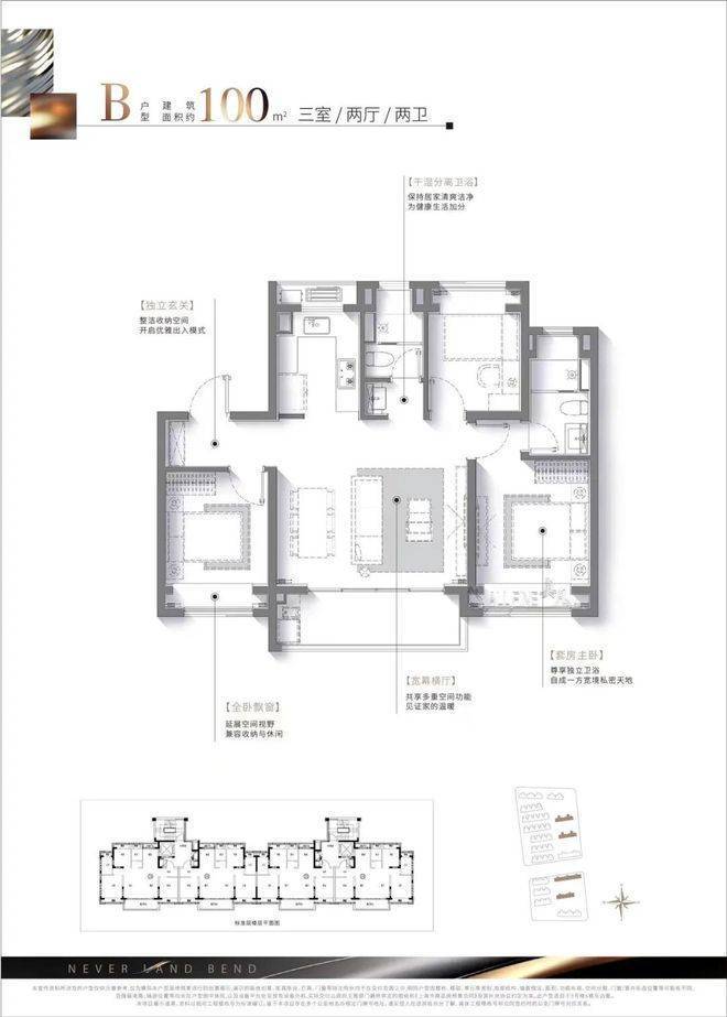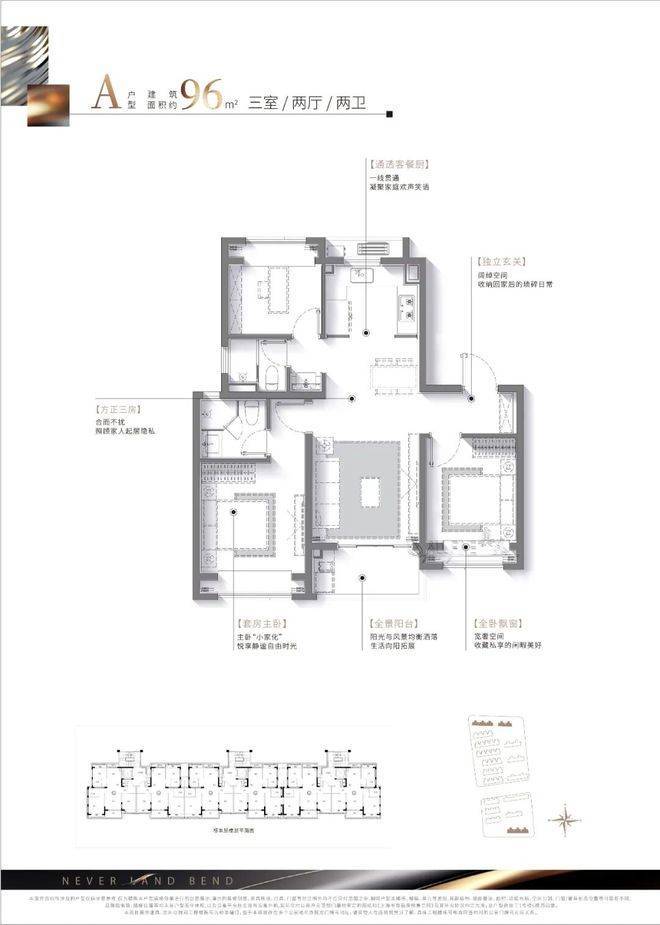 - **小高层(精装交付)**:主力户型包括建面约96㎡/100㎡的三房和126㎡的四房。户型设计方正,南北通透,全明采光。三开间朝南、主卧套间设计、U型厨房、双阳台等细节,充分考虑了现代家庭的生活动线与居住舒适度。精装交付,配备中央空调、地暖、新风三大健康系统,省去装修烦恼,即买即住。