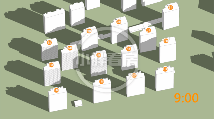 由于楼栋建筑朝向为东南偏转和夏季太阳角度问题,楼栋在下午处于阴影中,日照略有缺失,不过反而有利于减缓夏季西晒。6#低层受遮挡。就具体遮挡时间而言,6#主要在上午受9#遮挡。