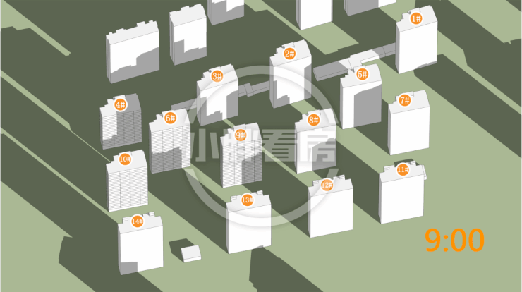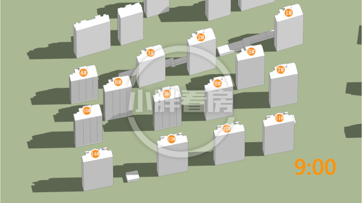 4#6#9#10#低层受遮挡。就具体遮挡时间而言,4#主要在上午和中午受6#10#遮挡。主要在上午和下午受9#10#14#遮挡。9#全天不同时间段均受遮挡。10#主要在上午和中午受14#遮挡。
