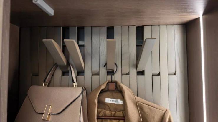 进门后玄关处左右手都有通顶玄关柜,内置鞋柜精灵,可以看到玄关内部的隔板也是高度不一,普通鞋子、高筒靴、雨伞架等等,都有分区。
