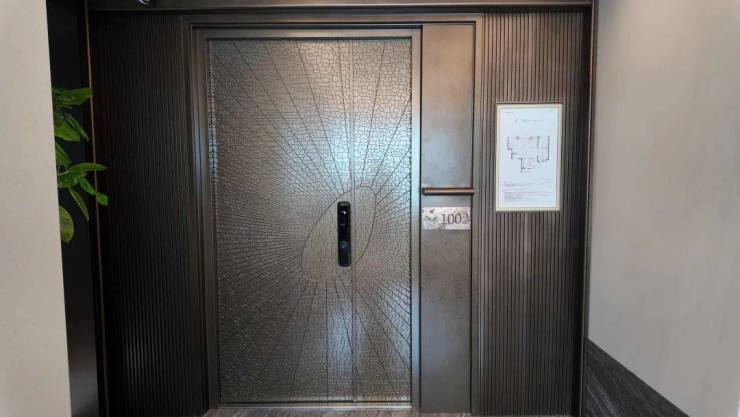 除105㎡以外的大户型(117㎡、143㎡),均为这种子母门设计,非常大气。每户门旁都有一个带射灯、奢石背景以及项目LOGO的门牌号。