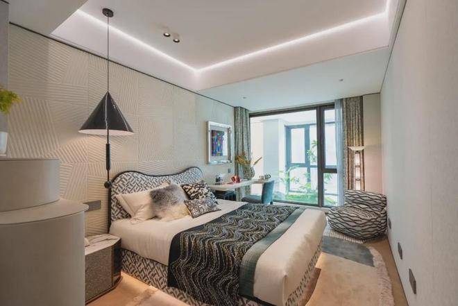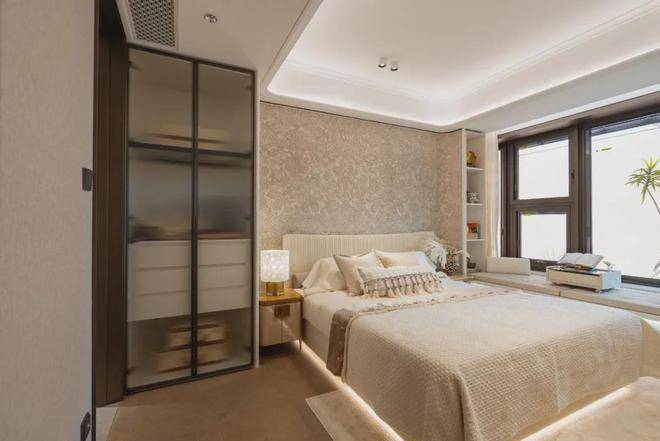 豪华的套房设计,北侧卫浴飘窗+南向床边双飘窗的设计,更是把这个空间的视野和收纳空间延展开来,尺度感真的很惊人。