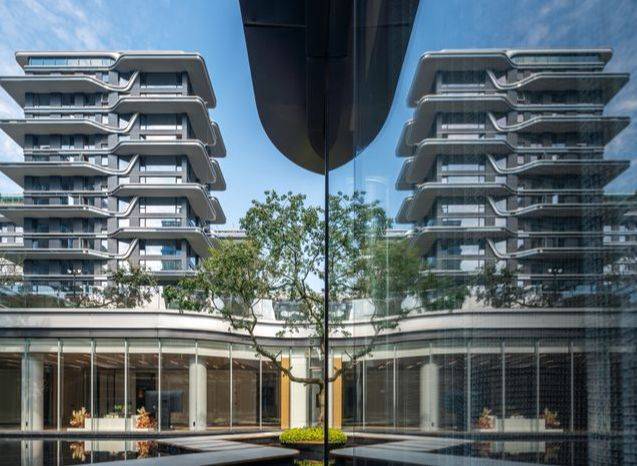 社区景观方面,项目运用室内手法室外化设计构想,将垂直景墙、悬浮观景台与叠水景观立体穿插,形成情随境转的沉浸式体验,自然元素渗透进室内,并与室内空间动态互动。