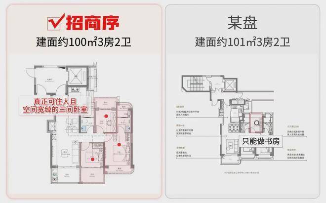 这是百平米3房那么多年一直无法解决的通病,但招商序的百平米3房却截然不同,TA凭借着3阳台的设计,给到客户一个真正的三房户型: