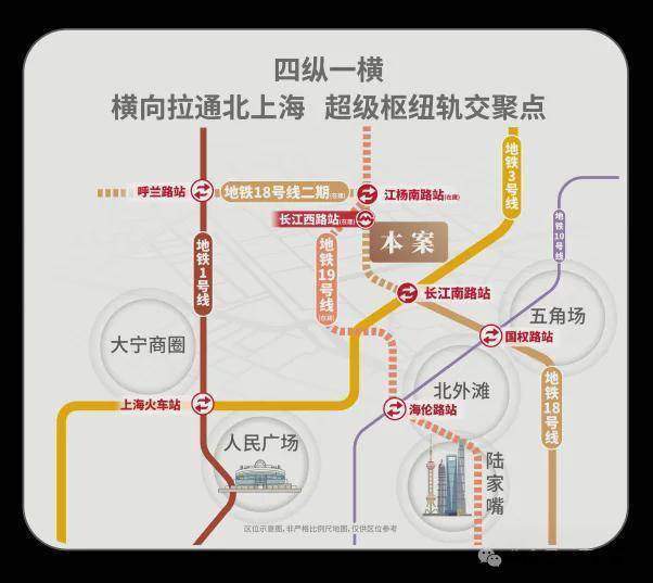 地铁18号线横向拉通了原本纵向不相连的四线地铁:1/3/18/19,将北上海横向联通,成为区域轨交的交汇聚点;项目紧邻长江西路地铁站(直线距离约150米),1站江杨南路,5站复旦,7站五角场。