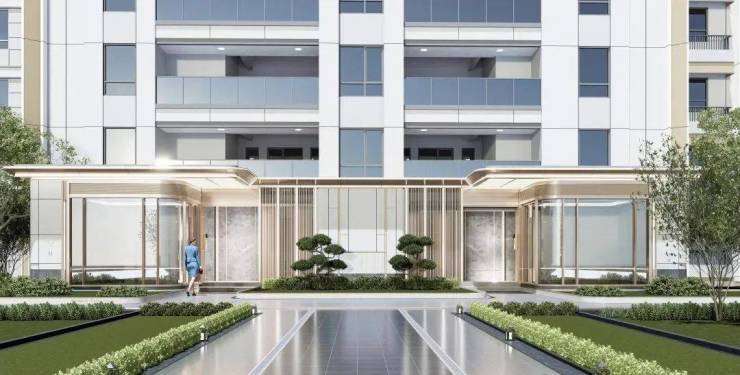 社区入口对标慢奢酒店风格打造,融入高定细节,诸如酒店感仪式门头+环岛式尊崇落客+迎宾式花园设计+精装地库等。