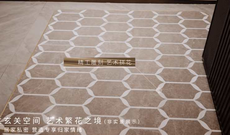 当然,超出我们预期的是,在约126㎡的户型中,装标再次升级:入户玄关采用海派风格中常见的整块艺术拼花设计+金属包边,仪式感更加突出: