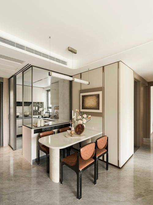 归家门厅设计为弧形顶棚,非对称构图,圆润的形式提供给业主放松的情绪价值。可以说是处处体现人居的松弛感和舒适度。