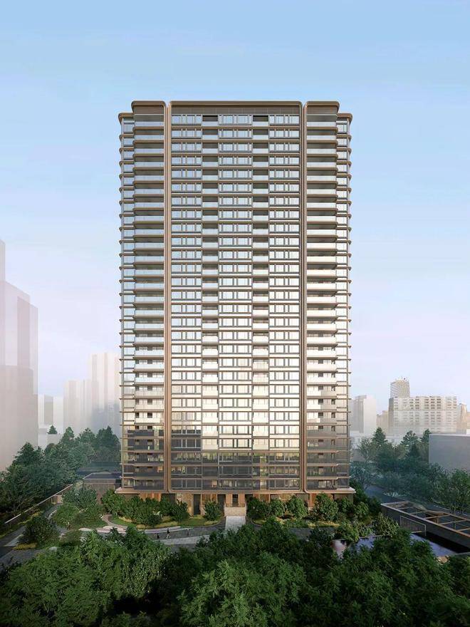 尤安团队设计的海派现代风外立面呈现超高辨识度!经典三段式设计,蓝灰色玻璃、仿铜色铝板、深色石材搭配圆弧倒角收边,用料昂贵奢华、质感无敌!