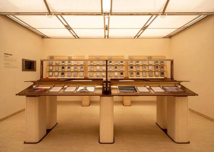皇家白奢石、Prada绿皮革面奢石、砖纹定制铝板... 细节中透露出精致与考究。工艺工法间对72种奢材的展示,让人心悦诚服。