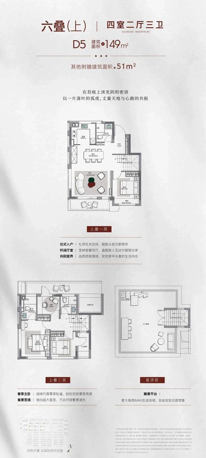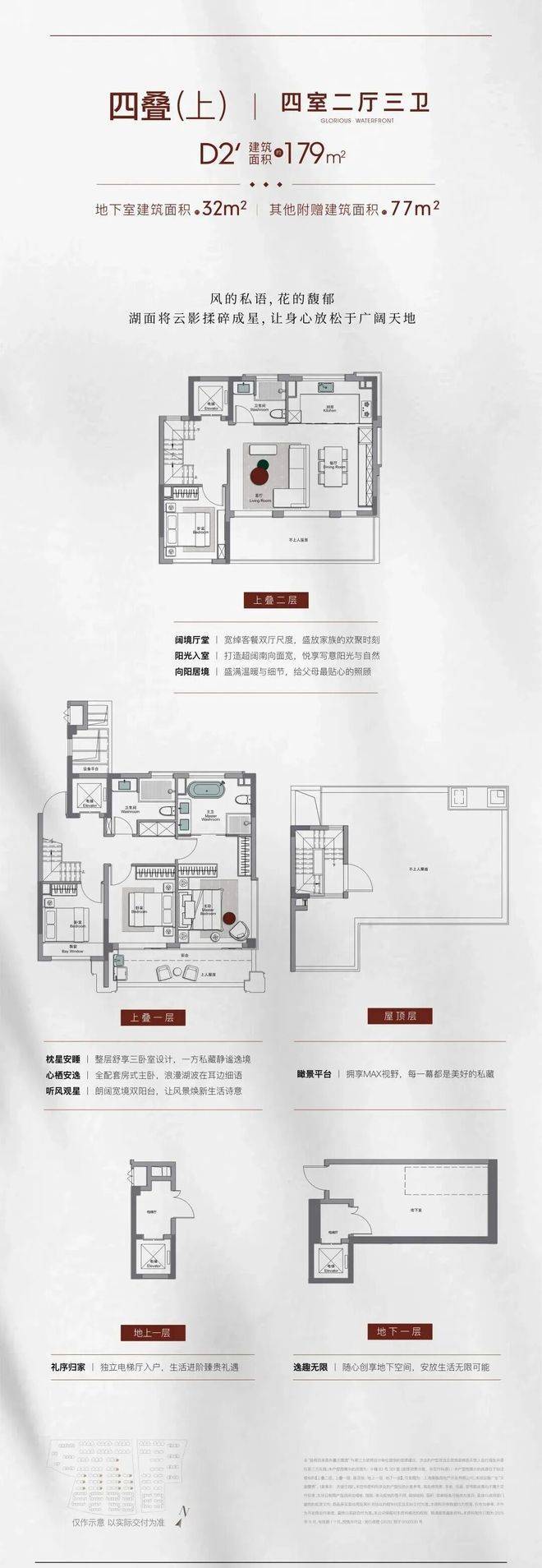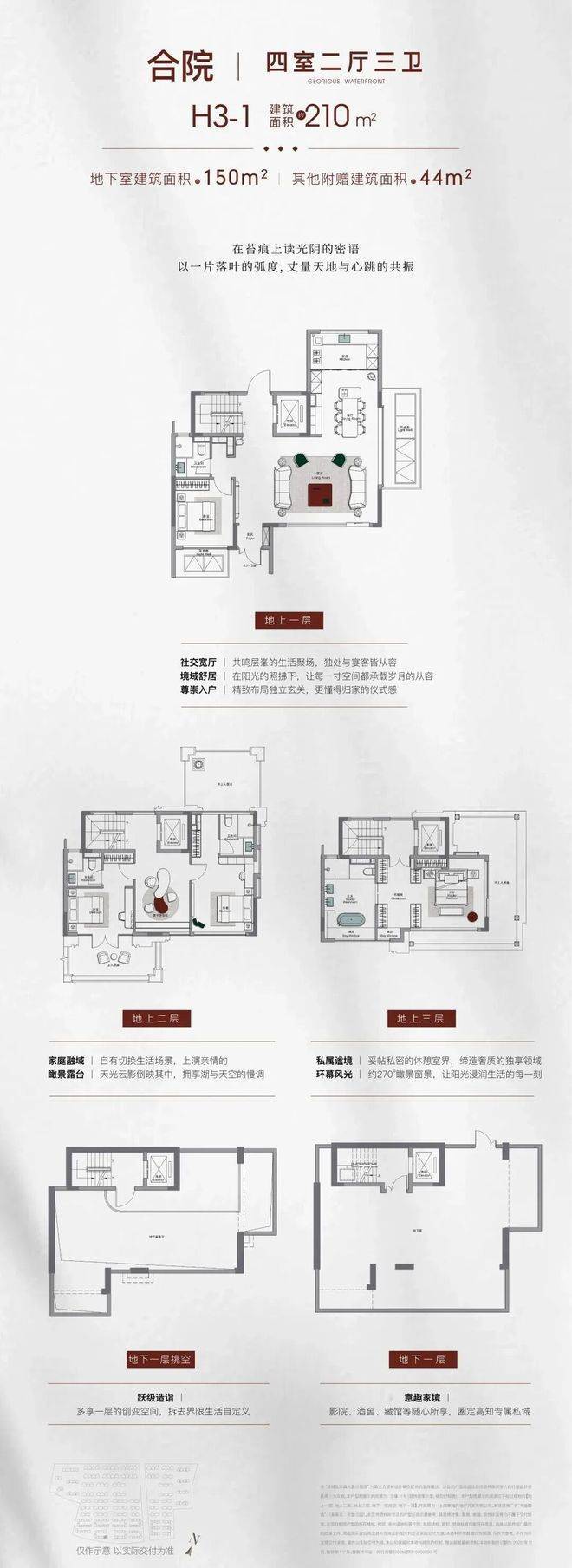2nd.约210-230㎡法式合院 这才是别墅应有的样子相较于传统别墅,合院产品通过围合庭院,将活动空间从室内延伸至户外,实现从"别墅"到"院墅"的升华,更契合中国人的居住哲学。挑空地下层,可划分为双层空间,实现约169㎡使用空间,与知己相聚,或收藏个人志趣,抑或是作为储藏空间,无限生活尽可想象于此得到满足。其他附赠面积也达到约72㎡,多个空中露台+屋顶瞰景平台,既可以实现城市人卸下喧嚣、沉浸自然的梦想,也可以满足孩子摘星揽月、秘密花园的梦想。约35㎡奢阔客餐双厅,奢阔尺度足以容纳10人的盛宴,让大家族的温馨互动与雅仕层峯的社交宴请于此从容上演。首层套卧,平权主义设计,配置独立卫浴以及内庭院,为家中年长者安置一片安全舒适的私属空间,享受阳光与自然的照拂。整层主卧套间,给予主人一方独立私享的静谧天地,步入式衣帽间内还能安放女主人的梳妆台;足够大尺度的卫浴空间里,大size的按摩浴缸也可轻松安置。四套卧+独立入户门厅+私享电梯+大品牌奢配精装,每一个细节都超越对于别墅的向往!