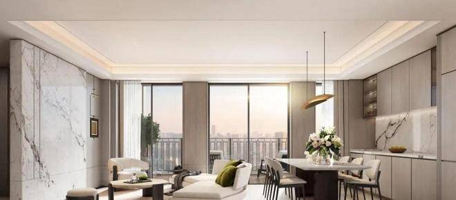 项目整个餐客厅均为岩板交付,岩板的尺寸达到了2.4米*1.2米,这是市面上非常罕见的大板配置,即便是市区豪宅,用的大尺寸也不过是1.8米!