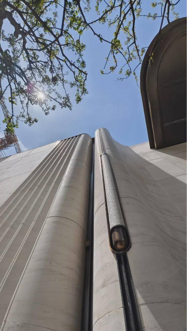 约7.9米挑高的酒店大堂顶部,用一整块玻璃打造的全景天窗,营造出了天光漏隙的隐奢感,光照进来,整个纵向的空间感,更加强烈。