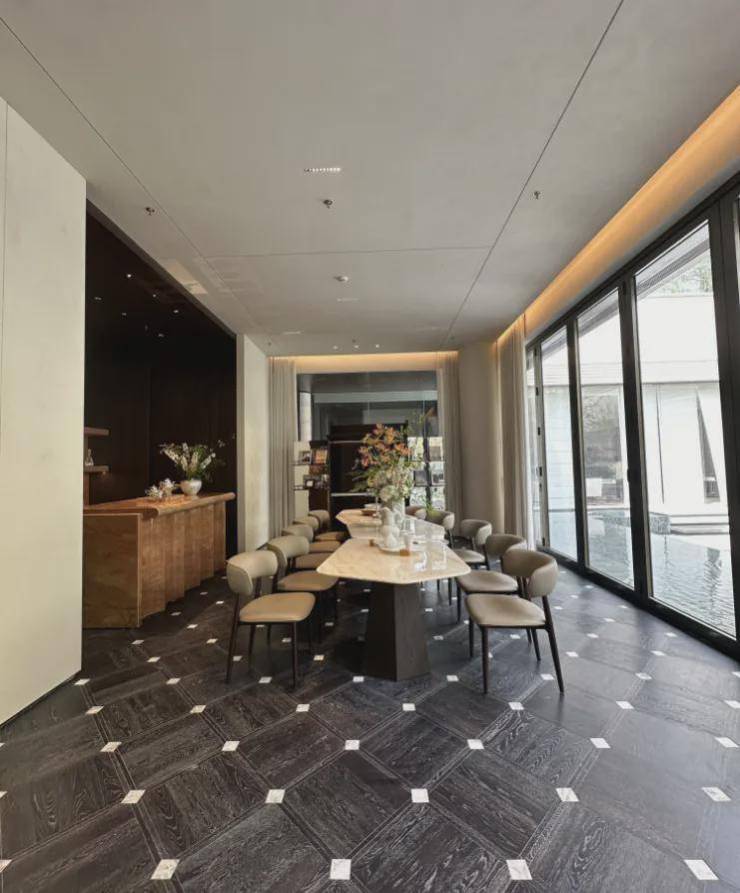 整块奢石打造的吧台,背后就是秸秆手工拼出纹路的高约巨型木质屏风,外面是小区的下沉式庭院,视觉上有豁然开朗的感觉。