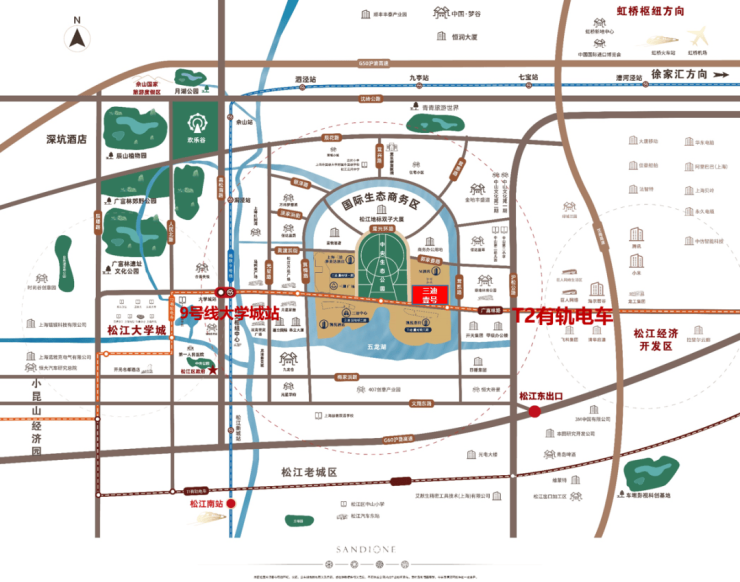 交通:9号线松江大学城站约1.7公里、T2有轨电车站点100米,自驾:G60沪昆高速。