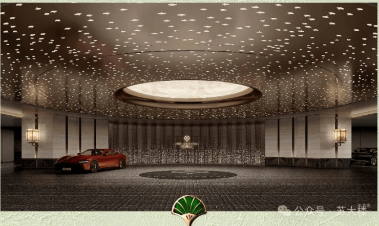 The light belt car ramp, combined with the large stone wall cut metal ceiling, creates a sense of noble homecoming ceremony.