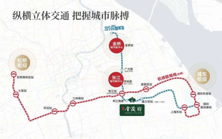项目更是浦东外环旁少有的轨交盘,与 21号线申江南路站(在建) 直线距离约800米,与 11号线康新公路站直线距离约2.5km,与 机场联络线张江站(在建)直线距离约2.1km,通达全城。