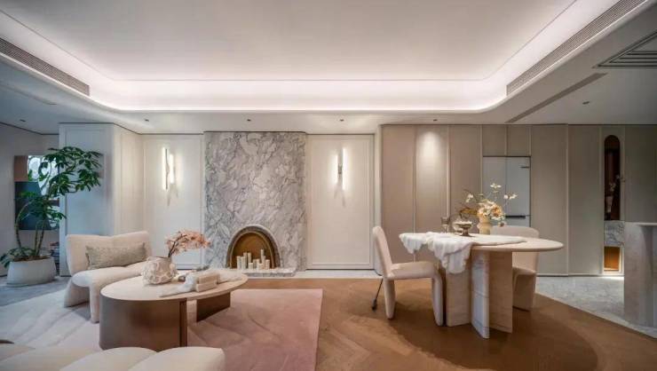 整个室内精装风格为此前大户型中最受欢迎的 轻法式设计, 弧形吊顶搭配无主灯设计,柔和浪漫氛围十足!还特地在客厅背景墙打造了 弧形石材壁炉墙面、地面 鱼骨拼实木地板与石材也做了弧形处理,提升空间灵动性,小资惬意