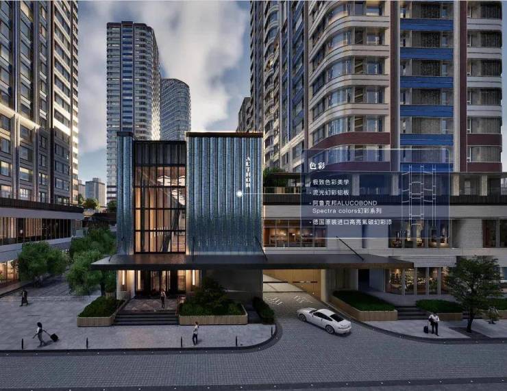 入口的会所立面,采用 独家调制的幻彩铝板,不同时间不同阳光照射下,会呈现不同色泽,一眼就流光溢彩比肩高奢酒店。
