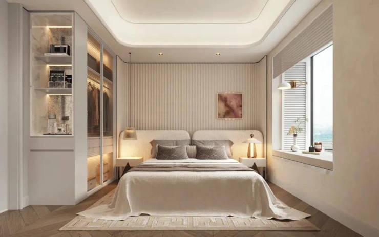 主卧迷你吧山水白大理石包边、背景墙采用奶白色弧形皮革硬包、飘窗法式百叶格栅屏风造型细节拿捏;次卧作为兴趣空间使用,居住幸福感满满