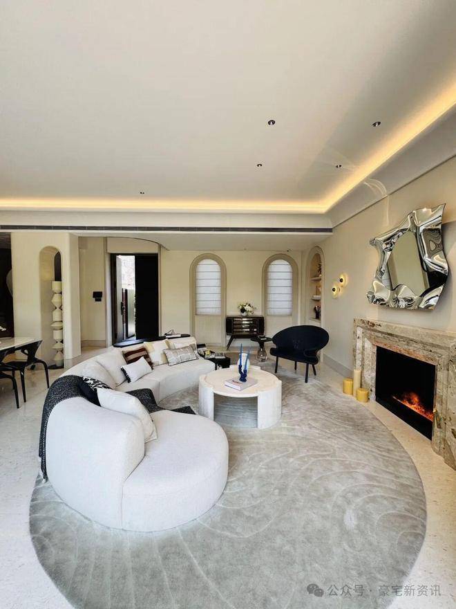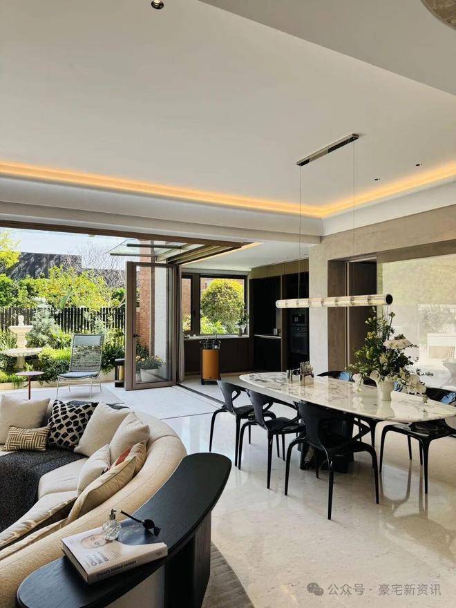 「无界空间」:客厅270度转角无柱设计,搭配落地玻璃,开阔视野将院中风景迎入日常。