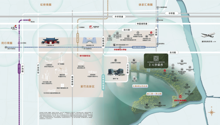 住宅地块临近在建轨交23号线华东师范大学站,建成后可便捷通往徐家汇等城市核心区域。周边有虹梅南路高架、沪金高速、申嘉湖高速、东川路、龙吴路等道路网络,让居民轻松畅达城市各处。