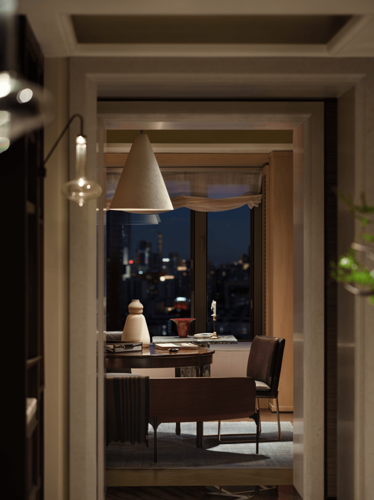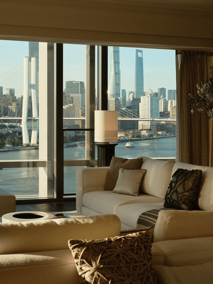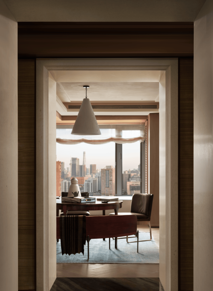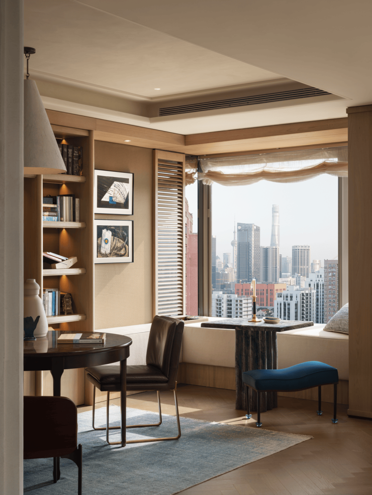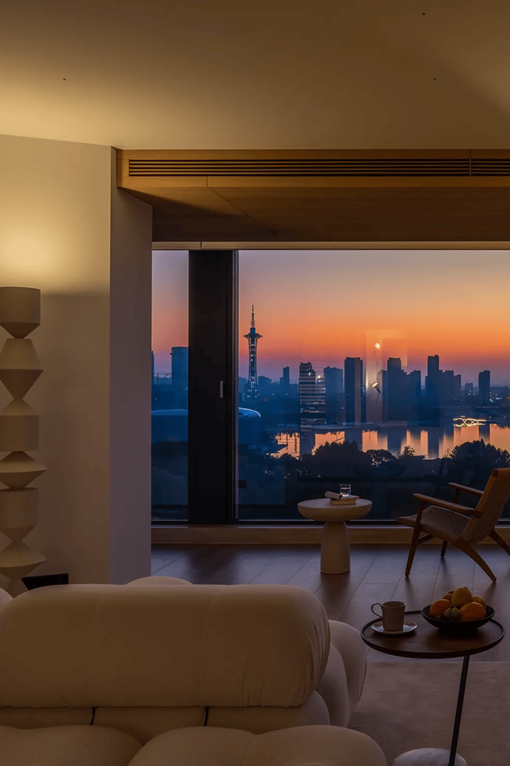 临飘窗处, Søren Horn的曲线靠背椅 ,以优雅线条柔化环境,成为阅读或冥想的温暖角落。远处不同时段的东方明珠犹如一幅静物画,当夜晚时分铂金色的灯光洒落,更添朦胧意境。