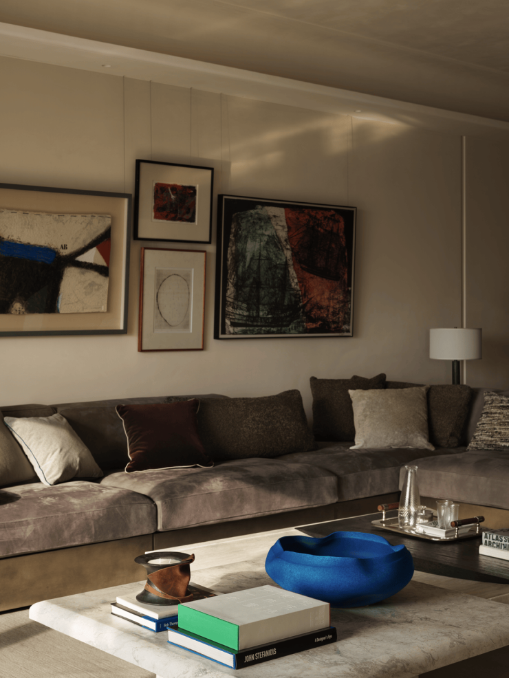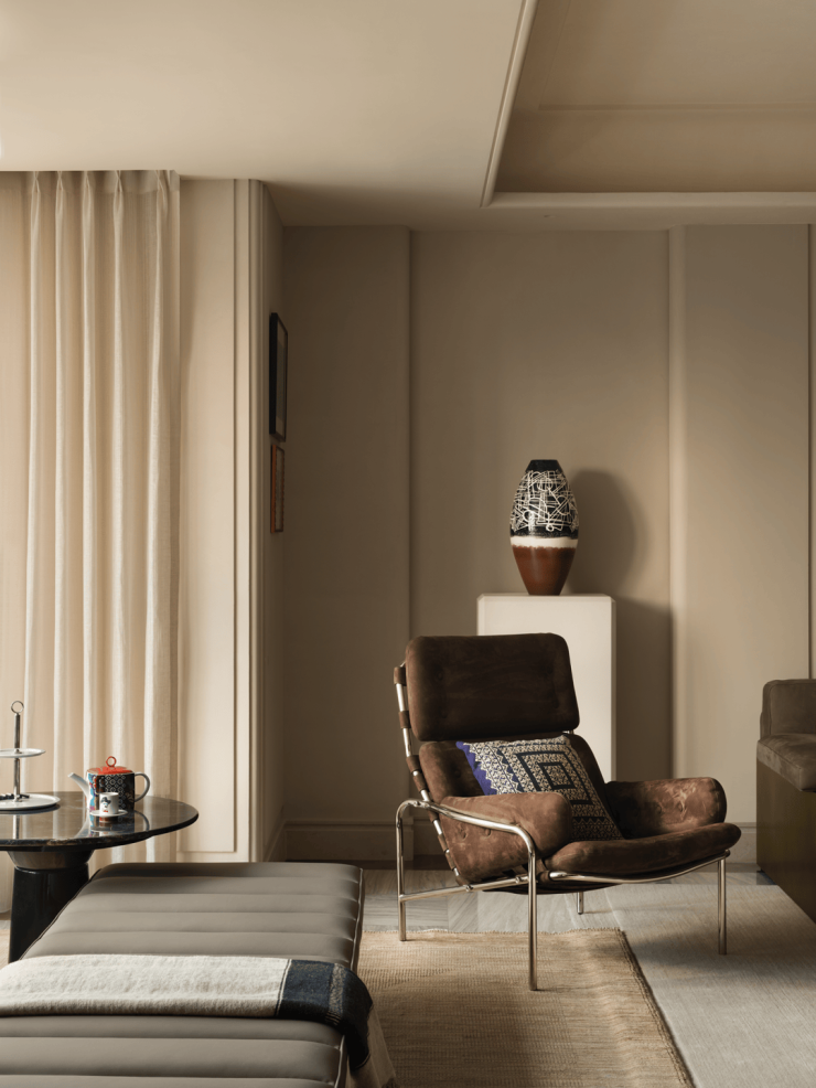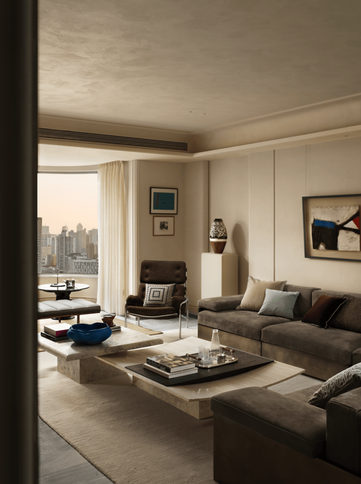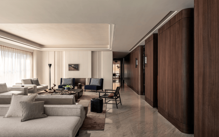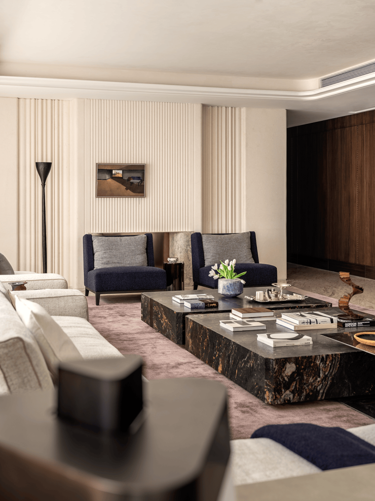 空间中心,超尺度转角沙发以柔软绒面皮革包裹出一隅沉浸式的休憩场域,成为功能与美感的双重载体。两张茶几在视觉上形成巧妙对位,一张线条柔和、带有微弧,另一张体量敦实、形态内敛。与之对话的沙发椅,则以流畅的线条与现代感形态介入空间,其雕塑般的造型与精微的材质触感,进一步延展了空间的感官层次。