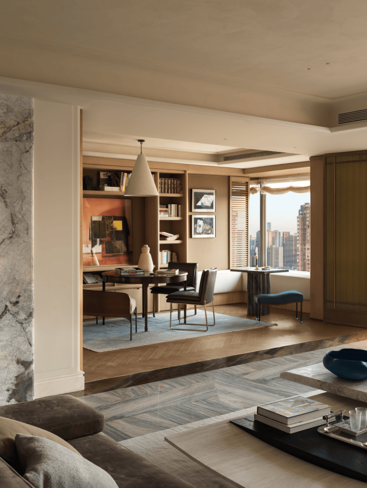 临窗区域刻意保留通透感,大幅落地窗如画框般框取城市景致。宽厚的皮革矮榻沿窗延伸,阅读、聚会或放空时,都能与城市的昼夜相伴。