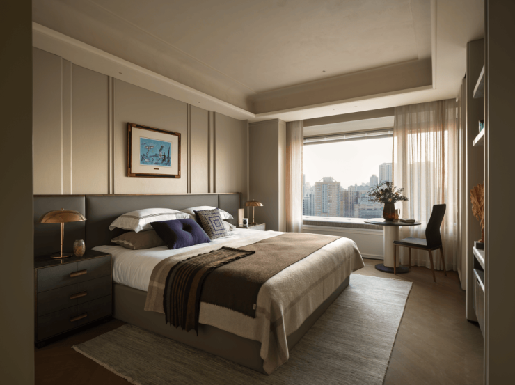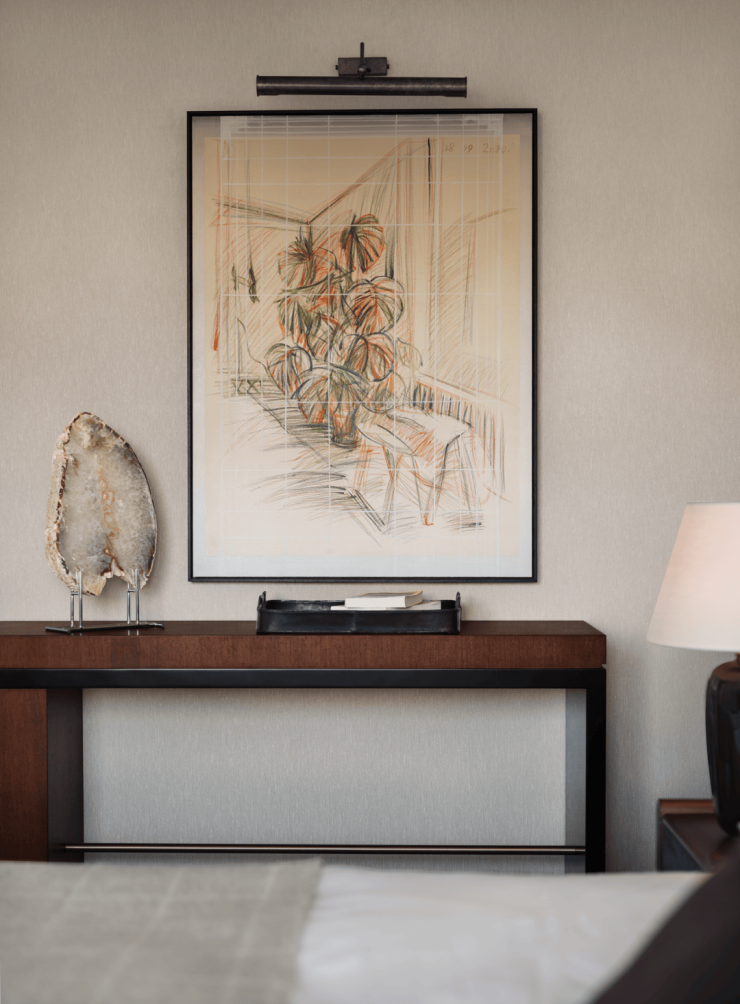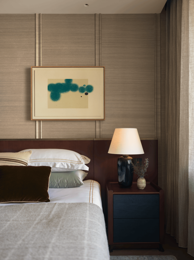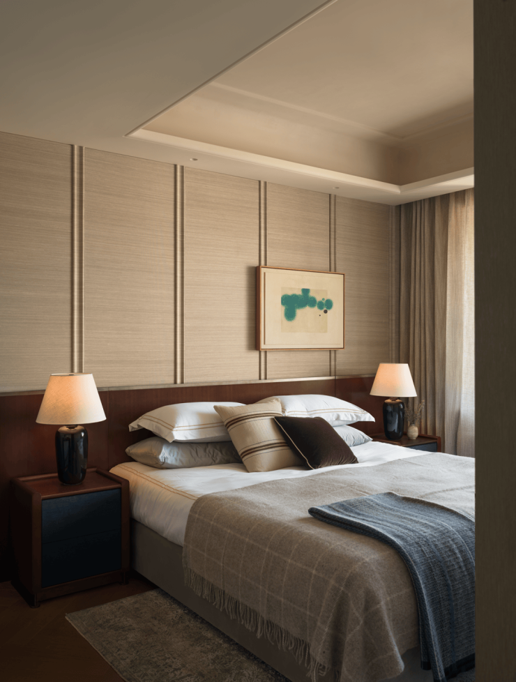 主卧延续整体设计语言,空间氛围转向沉静与内省,塑造优雅而深刻的生活范式。艺术版画赋予空间戏剧张力,暖灰调皮质床靠、珍珠鱼皮床头柜、来自丹麦的羊绒织物与手工锤打的黄铜灯具并置,让经典被解构、转译,自然地融入当下的感官体验。