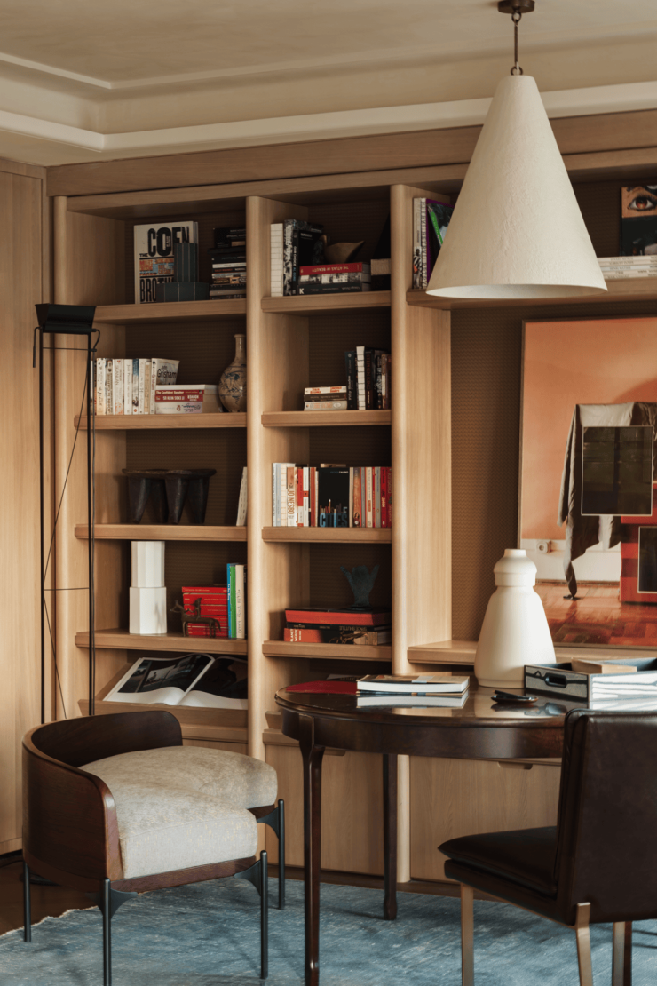 照明设计兼顾功能与氛围,石膏吊灯提供柔和的光源,居中圆桌打破空间方正格局,地面一抹蓝色地毯划定区域,形成秩序而不失温度。由Walter Monici设计的Opus落地灯静立书柜一侧,非刻意装饰,而是日常的一部分。