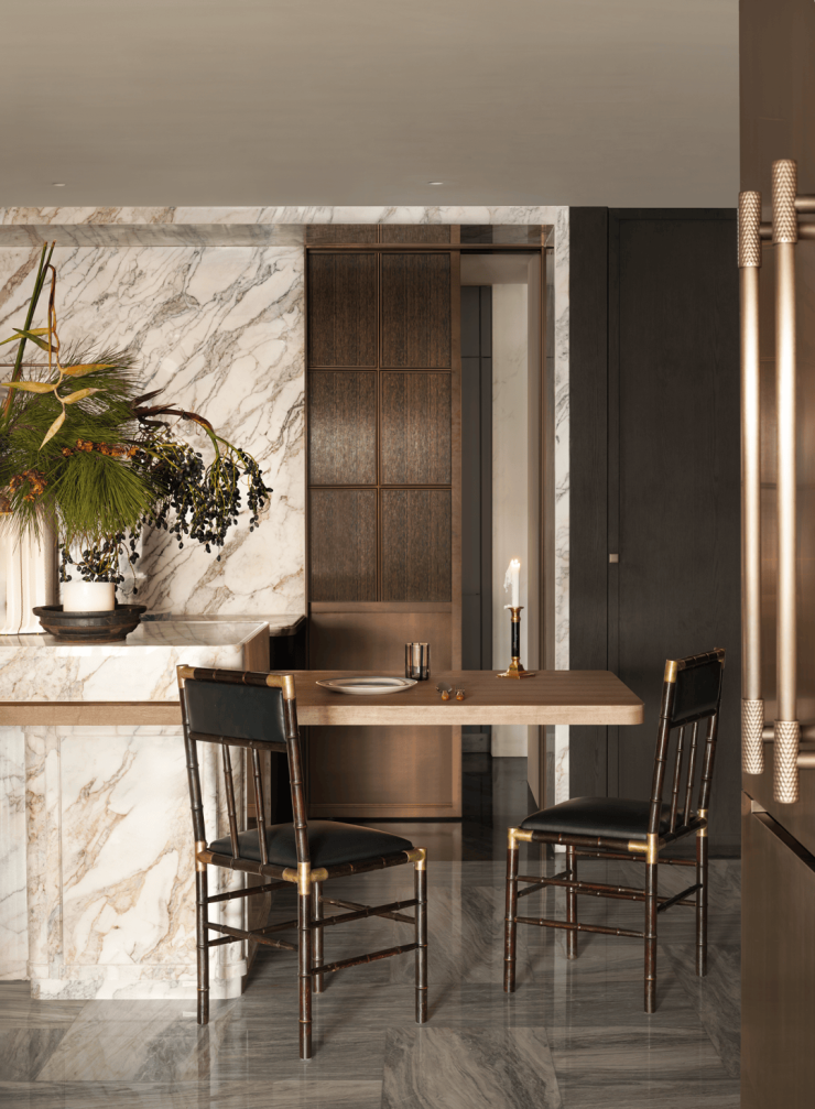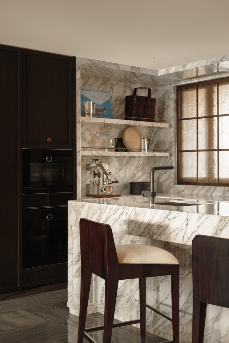 延伸的实木台面作为早餐区,木质肌理赋予空间轻松氛围,青铜餐椅兼具功能与雕塑感。餐厨空间在功能与美学间自然平衡,呈现松弛而日常的艺术气息。