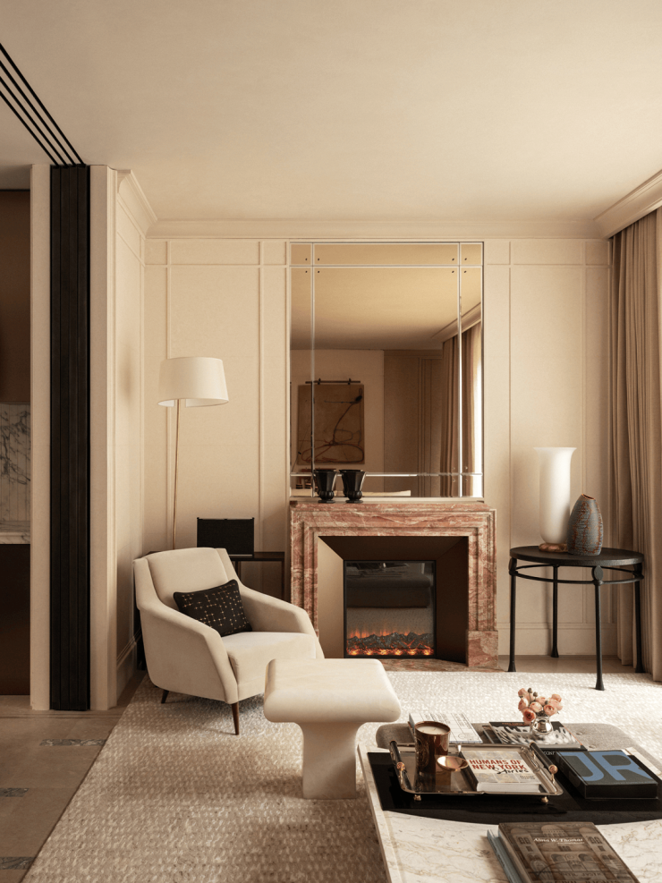 会客厅以围合式布局重塑空间重心,在社交礼仪与日常栖居之间寻得微妙平衡。壁炉承载着法式美学的经典叙事,成为贯穿始终的温暖线索;天丝地毯的细腻肌理与宝格丽石材的温润色泽,则为艺术陈列奠定了沉稳而亲和的基调。
