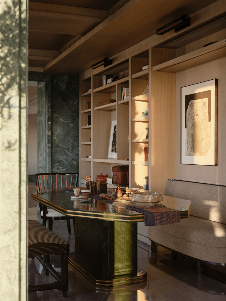 设计团队始终认为,折衷是一种具有高度自觉意识的「选择性亲和」。这意味着设计不再拘泥于风格的纯粹性,而是以居住者的审美意志为核心,在不同风格、不同时代、不同材质的碎片中,发现其内在的共振。