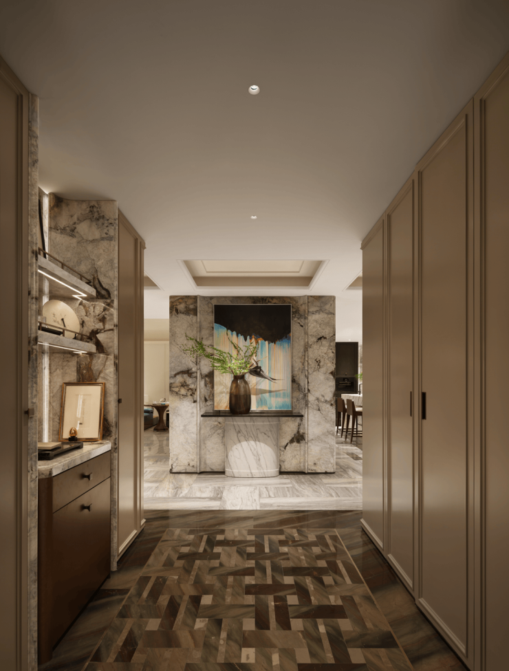 推门而入,左侧是开放柜体,右侧则是步入式行李间,两者沿一条清晰的横向轴线展开,空间秩序感油然而生。整块巴西利亚奢石打造的过廊,以克制的姿态奠定空间经典秩序的基调,既是动线缓冲,也构成归家后的视觉锚点。