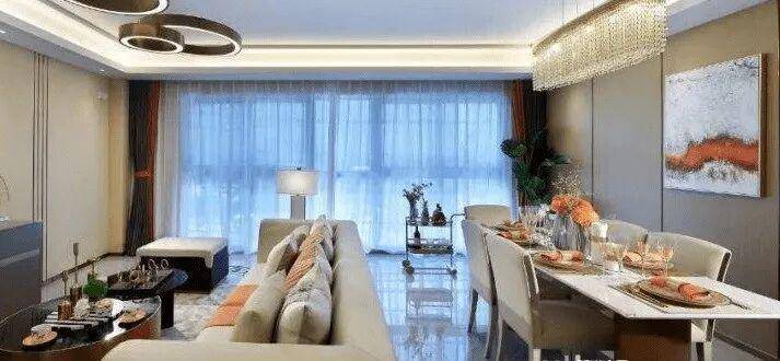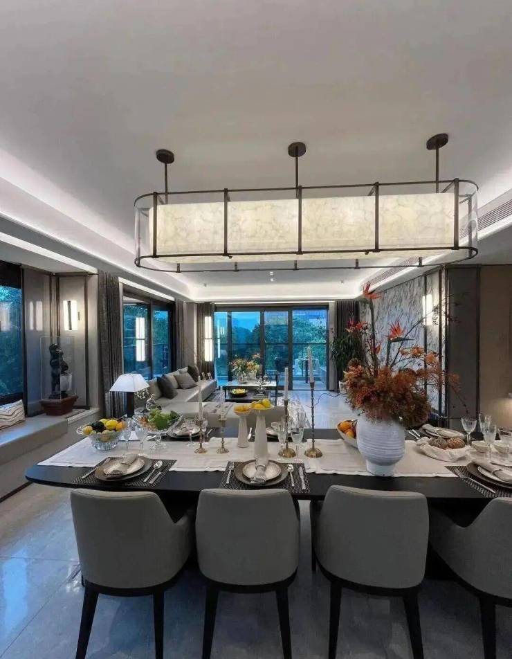 纵深超长的客餐厅,整个客厅做的是客餐厅一体化的设计,客厅空间足够大;两边落地窗,采光无敌视野通透