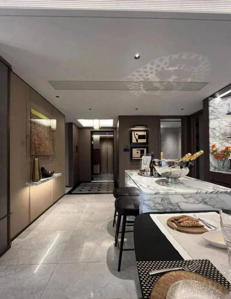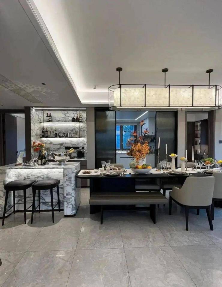 奢石岛台和餐边柜搭配实木餐桌,天然石材的质感和实木餐桌的温馨并存