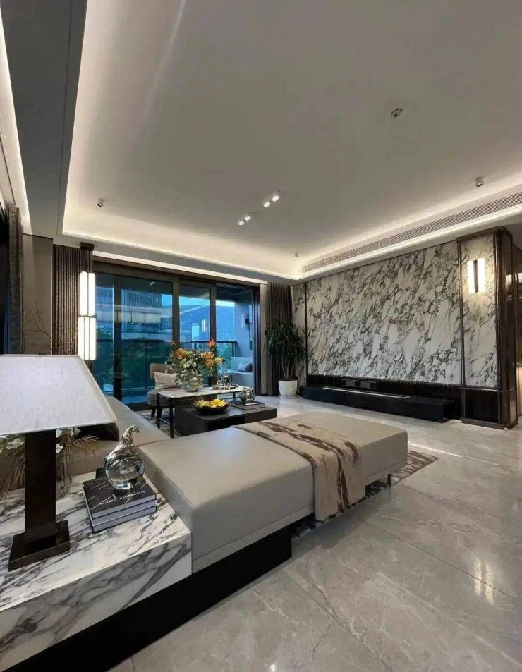 客厅背景墙用的是天然宝格丽大理石做成的,奢华大气!无主灯的设计尽可能的保留了原有的层高,使得客厅的空间感更好,显得更大