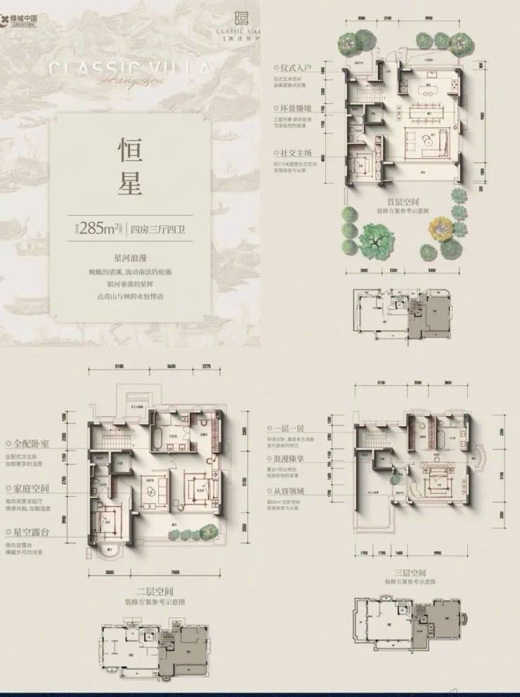 叠排产品遵循“现代形、东方意”内涵,低密产品,最主要追求的就是“有天有地,有私密感”,所以附加值的打造,变得尤其重要。所以,我们先讲的是附加值。建筑面积约235~300㎡四层庐系叠墅,