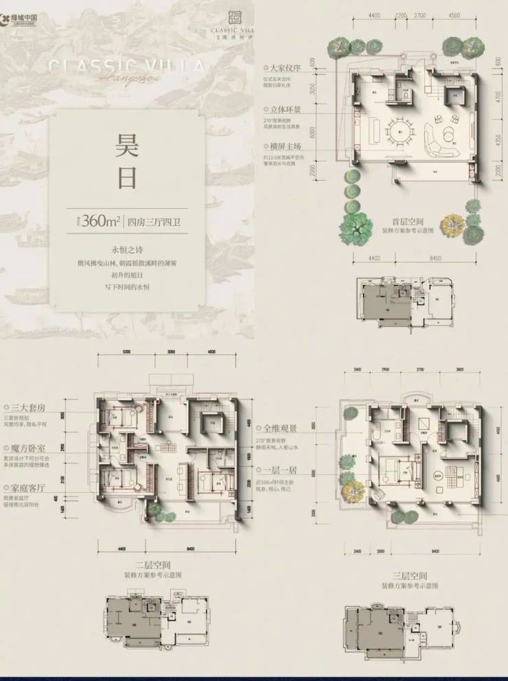 产品类型:包含99套法式联排(285-400㎡)和264套现代中式叠墅(235-300㎡),总户数363套3。