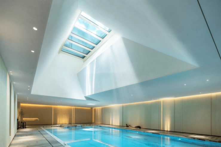 第三重,言上会己,专属于业主的惬意空间。仿罗马浴场的泳池,让业主在这里自由放松和运动。整个空间,引自然光入室,天窗之上有水波,池面上是水影,在地下三层营造出一个山林间氛围,自然自在。