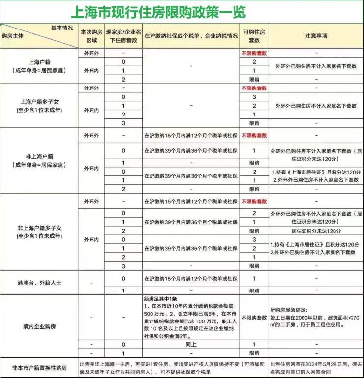 (注:1.外地户口在上海唯一住房在2024年5月28日后出售并网签,再购房不管是新房还是二手房不受社保与个税的限制,(不受环线限制)全上海房产都可以买。)