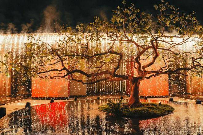 其枝干舒展,骨架苍劲,叶片随四季更迭而变幻色彩,春嫩、夏碧、秋绯、冬骨,宛若园中的四季诗人,与乌桕水瀑共同吟唱“在水一方”的灵动诗篇