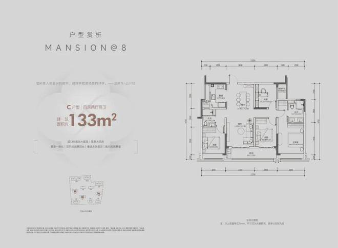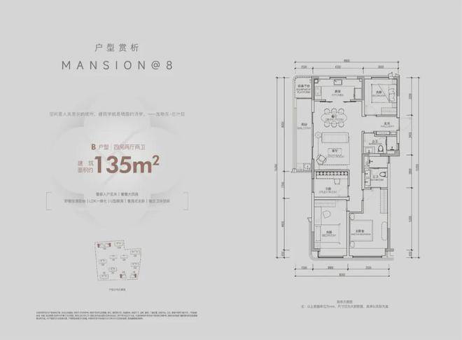 建面约135方边套户型,在空间设计上,升级户型灵动性和社交空间最大化,精心布局入户玄关,近40方的光幕大横厅、主卧星级套房、全景飘窗、约4.3米面宽的厨房等空间系统,完全是以豪宅的尺度奢享不同阶段的生活。
