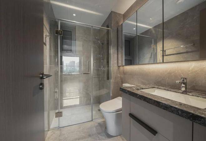 用上了德系顶级品牌唯宝(如今早已是TOTO、科勒当道)。卫生间均配摩恩品牌毛巾架、唯宝连体式马桶,主卫加智能盖板,大户型还配唯宝双台盆,是市面上许多同类项目难以企及的。