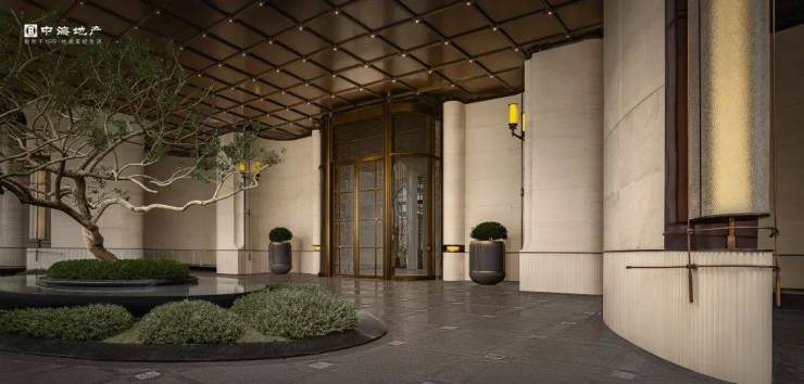 但如果近距离看,项目的入口细节之处又不失奢华,尤其是大量名贵石材的运用绝对是大手笔,搭配波光粼粼的水景与挺拔典雅的铁冬青,豪门大院的气质扑面而来。