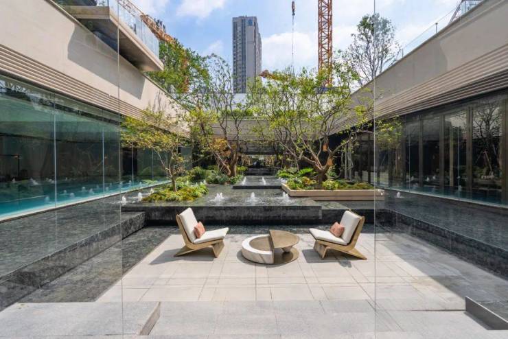 比领邸做的更细节的是,云邸玖章非常关照每个人在空间里的感受,特别升级了一个风雨无阻的连廊空间,哪怕是最近的梅雨季,业主都能更好地与自然接触,感受自然的治愈。