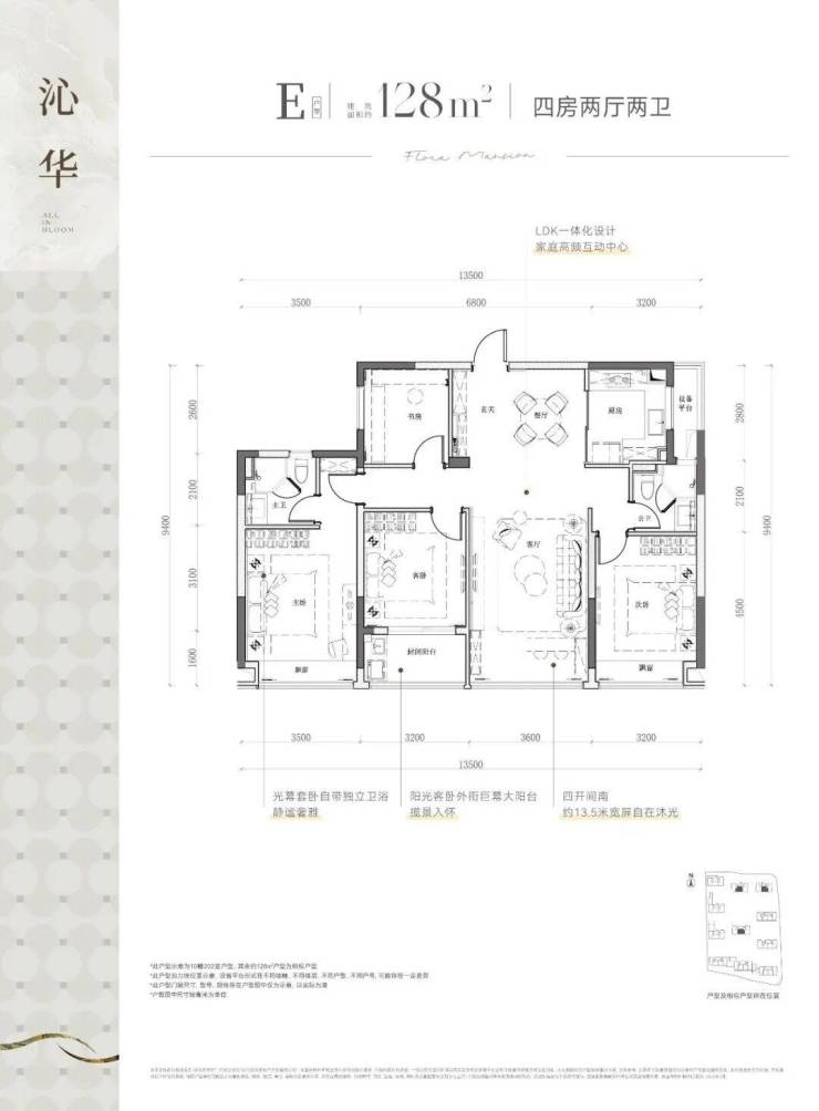 建筑面积约128平方米的四室两厅双卫户型,设计巧妙,四开间均朝南,配备私密式阳台,享受充足的南向自然光照,营造出开阔而明亮的居住空间。